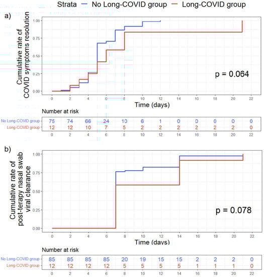 Kaplan–Meier curves comparing time-to-event between Long-COVID group (red) and No Long-COVID group (blue). (a) Time in days of COVID symptoms resolutions. (b) Time in days to obtain the first negative nasal swab after therapy. The reported p values resulted from Log-rank test. Time-to-event were assessed with Kaplan–Meier plot and compared with log rank test.