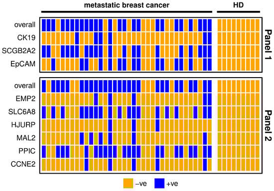 Heatmap showing metastatic breast cancer patient (n = 36) and healthy donor (HD, n = 9) samples for each marker separately and overall. For the definition of positivity, a threshold was set considering the gene expression levels in the HD group, in order to allow a maximum of 10% positive findings in the HD group. Samples with positive findings are marked blue and with negative findings orange. Panel 1 is shown in the upper graph and Panel 2 in the lower graph.