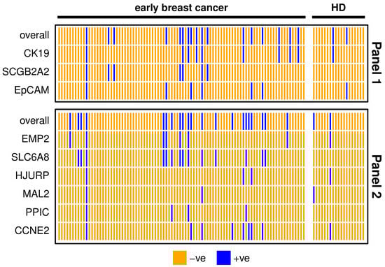 Heatmap showing positive (blue) and negative (orange) early breast cancer patients’ (n = 90) and healthy donor (HD, n = 19) samples for each marker or overall, comparing markers from Panel 1 (upper graph) and Panel 2 (lower graph). For the definition of positivity, a threshold was set considering the gene expression levels in the HD group, in order to allow a maximum of 10% positive findings in the HD group.