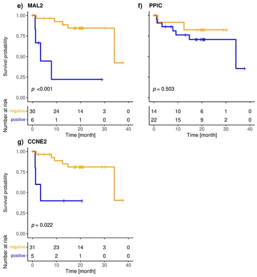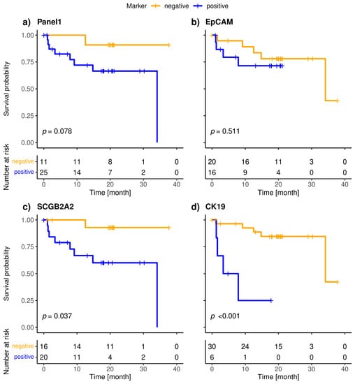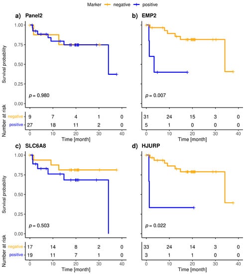 The included patients exhibited a median overall survival of 34.1 months, and 9/36 (25.0%) of the patients died during the observation period. The median follow-up of the patients was 20 months. The highly specific epithelial (CK19) and breast cancer specific (SCGB2A2) marker were significantly associated with shorter overall survival (Figure 3). The median OS of CK19-positive patients was 5.6 months, whereas it was 34.1 months for the SCGB2A2-positive patients. Among the Panel 2 markers contributing to positive findings in fewer patients, EMP2, HJURP, MAL2, and CCNE2 were associated with short OS (Figure 4); in contrast, EpCAM, SLC6A8 and PPIC were not related with OS. The six markers with prognostic relevance (CK19, SCGB2A2, EMP2, HJURP, MAL2, and CCNE2) detected in total 58.3% of metastatic breast cancer patients.