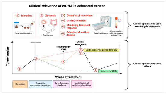 Clinical relevance of ctDNA in colorectal cancer. This figure depicts the critical applications in the clinical setting using both the current clinical gold standards and ctDNA. These include tumor genotyping in cancer diagnosis, assessing treatment response, tracking minimal residual disease and relapse, and monitoring clonal evolution. (1) Screening is routinely performed to detect CRC at an early stage using a fecal occult blood test (FOBT), but replacement by ctDNA has yet to be encouraged. (2) Diagnosis is performed before therapy to confirm the tumor’s presence. When using ctDNA, genotyping could determine the tumor profile and identify patients with a high tumor burden. Determination of tumor burden has the potential to help guide neo-adjuvant or adjuvant therapy and monitor response. (3/6) Detection of residual disease and recurrence is performed using radiologic imaging and carcinoembryonic antigen (CEA) detection. However, the former suffers from a delay in detection and the latter suffers from a lack of sensitivity. Assessment of ctDNA after therapy facilitates the detection of both emerging resistance mutations and minimal residual disease (MRD) before progression, with the potential for the non-invasive prediction of recurrence. (4/5) Guiding treatment and monitoring treatment response occurs based on the presence or absence of tumor lesions. On the other hand, ctDNA can guide genotype-directed therapy and allows for the monitoring of the response to treatment based on tumor burden. When acquired resistance to targeted therapies occurs, ctDNA can detect specific mechanisms or resistance, considering the different clones present within the primary tumor and all metastatic sites, and can guide treatment adjustments. In contrast, imaging and the CEA marker can detect the emergence of resistance without knowing the mechanisms of resistance. Created with BioRender.com.