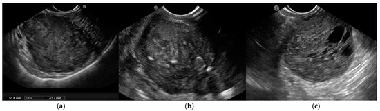 According to the European Society of Gastrointestinal Endoscopy (ESGE), EUS’s ability to define the morphology and features of the suspicion of malignancy render this technique the best diagnostic tool with which to characterize these lesions. EUS images show the location, size, originating layer (the fourth layer, which corresponds to the muscolaris propria), shape, internal echo pattern, heterogeneity, and vascularity of the lesion, as well as the presence of lymph nodes adjacent to or surrounding the tumour [31,32]. Several EUS features, including irregular borders, cystic spaces, ulceration, and echogenic foci, have been linked to a higher risk of malignancy (Figure 1).