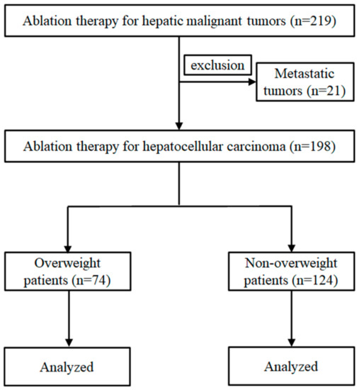 The prevalence of being overweight/obesity is increasing [8], and given its impact on an increased risk of metabolic comorbidities, cardiovascular diseases [9], and non-alcoholic fatty liver disease [10], it continues to gain more attention in disease management. In Japan, the focus is shifting to the impact of being overweight/obesity on HCC, along with the proportion of non-viral chronic liver disease [11,12]. Many physicians in Japan have conducted ablation therapy under real-time ultrasonographic guidance. However, subcutaneous fat reduces the resolution of ultrasound imaging, resulting in poor clinical outcomes. This study aimed to investigate the effect of being overweight on the outcomes of ablation therapy for patients with early-stage HCC.