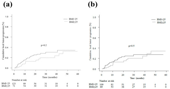 (a) Local tumor progression in patients with BMI < 25 kg/m2 and with BMI ≥ 25 kg/m2 in the crude cohort. The two groups showed no significant difference (HR 0.70, 95% CI 0.38–1.31, p = 0.2). (b) Local tumor progression in patients with BMI < 25 kg/m2 and with BMI ≥ 25 kg/m2 in the weighted cohort. No significant difference was observed between the two groups (HR 0.90, 95% CI 0.69–1.20, p = 0.50). BMI, body mass index; CI, confidence interval; HR, hazard ratio.