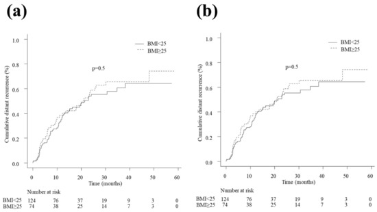 (a) Distant recurrence in patients with BMI < 25 kg/m2 and with BMI ≥ 25 kg/m2 in the crude cohort. No significant difference was observed between the two groups (HR 1.14, 95% CI 0.76–1.70, p = 0.5). (b) Distant recurrence in patients with BMI < 25 kg/m2 and with BMI ≥ 25 kg/m2 in the weighted cohort. The difference between the two groups was not significant (hazard ratio (HR) 1.13, 95% CI 0.95–1.35, p = 0.2). BMI, body mass index; CI, confidence interval; HR, hazard ratio.