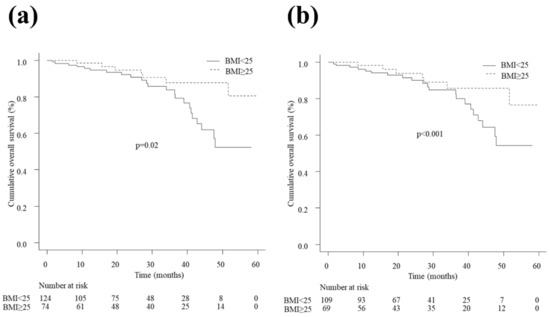 Thirty patients (15.2%) died during the follow-up period. The 1-, 2-, 3-, and 4-year survival rates were 95.6% (95% CI 89.7–98.1), 90.8% (95% CI 82.7–95.2), 83.8% (95% CI 72.9–90.5), and 52.4% (95% CI 33.9–67.9) in the non-overweight patients and 98.4% (95% CI 89.4–99.8), 94.6% (95% CI 84.2–98.3), 87.7% (95% CI 74.3–94.4), and 87.7% (95% CI 74.3–94.4) in the overweight patients, respectively. No patient in either the overweight or non-overweight group reached the median OS. The survival curve was better in the overweight patients than in the non-overweight patients (HR 0.37, 95% CI 0.16–0.87, p = 0.02; Figure 5a). In the weighted cohort, the 1-, 2-, 3-, and 4-year survival rates were 95.2% (95% CI 91.2–99.4), 90.1% (95% CI 83.9–96.7), 84.8% (95% CI 76.6–93.7), and 54.3% (95% CI 38.9–75.8) in the non-overweight patients and 98.3% (95% CI 94.9–100), 93.9% (95% CI 87.3–100), 85.7% (95% CI 75.4–97.3), and 85.7% (95% CI 75.4–97.3) in the overweight patients, respectively. The OS rate was higher in the overweight patients than in the non-overweight patients (HR 0.36, 95% CI 0.25–0.51, p < 0.001; Figure 5b).