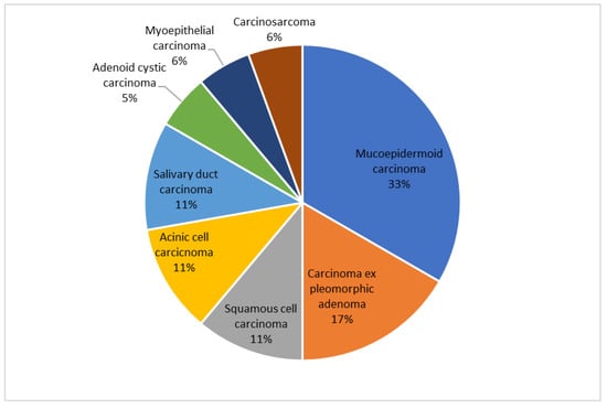 Eighteen patients with primary tumor of the parotid gland and fifteen with secondary cancer were included in the study. The most prevalent primary tumor was mucoepidermoid carcinoma (Figure 1). All secondary tumors were intraparotid metastases from cutaneous squamous cell carcinoma (SCC). No subject had immunosuppression.
