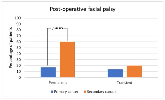 Post-operative permanent facial palsy was observed in 5 patients (17%) with primary cancer and 9 (60%) with secondary tumors (p = 0.010). In particular, such sequela was observed in those subjects who had pre- or intra-operative signs of nerve involvement or impossibility to achieve oncologic radicality with nerve sparing. No permanent palsy was observed in nerve-preserving surgery. Transient facial palsy was reported in 5 patients (17%) with primary cancer and 3 (20%) with intraparotid metastases (p = 0.604, Figure 2). Other complications were two sialoceles in patients with primary tumors and two wound dehiscence in subjects with secondary cancer. Two cases of partial superficial necrosis of the deltopectoral flap were observed and solved with second intention of healing or skin graft.