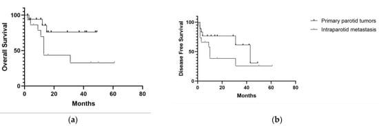 Our study showed a better OS for primary cancer, while DFS was not statistically different. Nevertheless, DFS was poor in patients with intraparotid metastasis. The lack of statistical significance is probably related to the small samples. Our results are in line with previous studies and are related to a generally higher tumor stage as a consequence of lymph node metastasis in the skin SCC group [5,6]. Immunosuppression is an independent prognostic indicator for reduced survival in subjects with intraparotid SCC metastasis [28]. In our case series, no immunocompromised patient was present. In the future, the further development of immunotherapy for cutaneous SCC, such as cemiplimab, may improve survival.