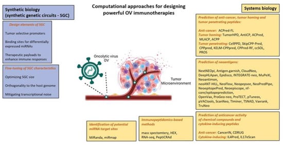 In particular, the great potential use of these applications is to overcome the current challenges faced in developing safe and effective OV-based immunotherapies. The SGCs packaged into OAds showed enhanced tumor cell targeting and the generation of potent antitumor immunity, in vitro and in vivo. To date, ligandome analysis has been successfully integrated into a streamlined pipeline for the generation of personalized cancer vaccines in a murine model of colon cancer, of TNBC, and in human mesothelioma. The selection of the best peptide candidates to insert in the backbone of OVs can be refined using a free tool, HEX, able to identify tumor antigens similar to viral and bacterial ones based on molecular mimicry mediated by cross-reactive T-cells. To implement safety and efficacy of OVs, the technologies of transciptome profiling allow the creation of a big library of TAAs and tumor-specific promoters, useful for modifying the OVs with restricted tropism to tumor cells. Another appealing application is to manage the extensive immune network triggered by OVs, encoding payloads aimed at turning on the right switches of the immune system at the right time. Finally, numerous bioinformatic tools are available to find out immunogenic neoantigens and target peptides that can be inserted in oncolytic viral vectors. We retain that the synthetic and system biology strategies represent powerful tools to design a new category of OV-based immunotherapy, that can revolutionize the way cancer is treated. We hope that the principles outlined here will help guide the additional preclinical and clinical research development required to contribute to precision oncology research.