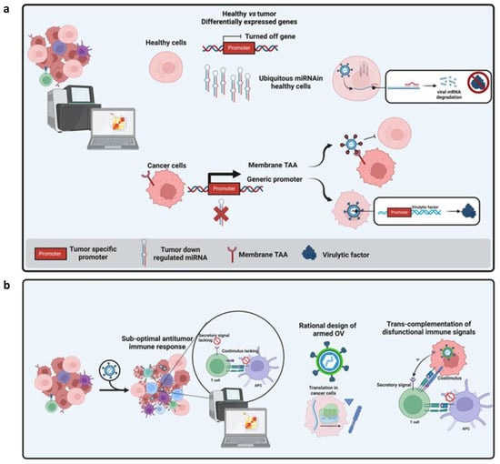 (a) Modalities to restrict tropism or replication of OVs based on multi-omics data. In the cartoon, a tumor transcriptome is compared to those of healthy tissues to identify differentially expressed genes (DEG). These genes have been reported as down-regulated or up-regulated in tumors. Different approaches can exploit these DEGs: when a miRNA is solely expressed in healthy tissues but is absent in cancer cells, matching seed sequences can be ectopically incorporated into the 3′ UTR of the viral gene to inhibit the translation of a given virulence factor in healthy tissues while preserving its functionality in tumor cells (1). By contrast, when a tumor-associated promoter is identified, its regulatory region can be used to replace endogenous viral promoters to allow transcription only in tumor cells (3). Finally, a membrane associated TAA, represented as generic receptor in the cartoon, can be targeted by targeted OVs where viral glycoproteins can host a bait to interact with the TAA. This bait can be an antibody fragment or even a ligand of TAA. (b) The concept of rational arming of OVs is represented. Perturbation in transcriptomic profiling of tumor bulk make it possible to identify sub-optimally activated immune pathways whose function can be improved by encoding the matching factors into the OV genome.