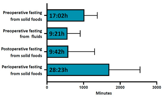 Preoperative fasting is advised to minimize the risk of pulmonary aspiration of gastric contents during anesthesia [1]. Therefore, recent international guidelines recommend a minimum fasting interval of 6 h for solid foods and 2 h for clear fluids before surgery [1,2]. On the other hand, excessively long fasting before and after surgery should be avoided as prolonged fasting is not only associated with increased patient discomfort [3,4], but also with decreased insulin sensitivity [5,6,7,8], altered inflammatory response [7,8] and higher surgical complication rates [3]. With the introduction of the ERAS (Enhanced Recovery After Surgery) concept, perioperative management has been rethought during the last two decades [9]. The concept of ERAS aims to reduce perioperative morbidity through a multimodal approach by attenuating the patient’s stress response before, during and after surgery, thereby promoting early and complete recovery from surgery [9,10,11,12,13]. A key component of ERAS in this regard is the optimization of perioperative fasting management with the avoidance of excessive fasting and the implementation of an early postoperative restorative diet [9,10,11,12,13]. In contrast to these recommendations, clinical data on perioperative fasting habits has consistently reported drastically prolonged perioperative fasting intervals in different health care systems and settings over the last decades [14,15,16,17,18,19,20,21]. So far, it remains unclear whether increasing implementation of ERAS protocols has led to optimized shorter fasting intervals in clinical routine practice. Therefore, we conducted this study to provide real-world evidence on actual perioperative fasting habits in a multicenter cohort and identify risk factors for excessive fasting.