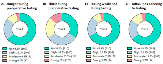 Condition during fasting. From right to left are shown: (A): Patients’ feelings of hunger during preoperative fasting. (B): Patients’ feelings of thirst during preoperative fasting. (C): Patients’ feelings of weakness during preoperative fasting. (D): Patients’ difficulties in adhering to fasting recommendations. Data are presented as a circle chart. Green indicates “no or none”, blue indicates “slight”, yellow indicates “moderate” and red indicates “strong”. Bellow the chart, the percentage of answers is displayed next to the legends. The number of patients is displayed in parentheses behind the percentage. n = number.