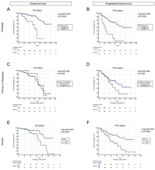 LAMN exhibited significantly increased OS and PFS compared to HAMN both in the whole cohort (p < 0.0001, respectively, Figure 1A,B) and in the case of primary tumors. There was no significant difference either in OS or in PFS between patients with primary and recurrent tumors (p = 0.8290 and p = 0.2840, respectively, Figure 1C,D); however, female LAMN patients exhibited significantly improved outcomes (compared to male patients) concerning both OS (p = 0.0337) and PFS (p = 0.0059) (Figure 1E,F).