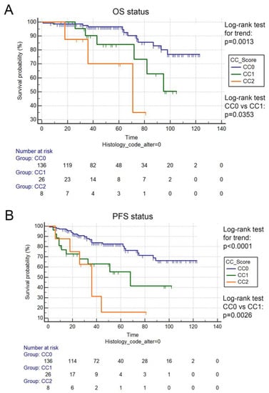 Prognostic role of CC score in LAMN. CC score was prognostic when using Log-rank test for trend, when comparing LAMN patients with CC0, CC1, and CC2 scores in the case of OS (p = 0.0013, (A) and PFS (p < 0.0001), (B)). Interestingly, when comparing LAMN patients with CC0 vs. CC1 situation, there was a significant difference in OS (110.8 vs. 86.5 months, p = 0.0353, (A) and PFS (97.8 vs. 60.8 months, p = 0.0026), (B)). Months for OS and PFS are described as means.