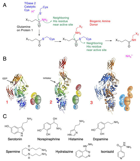TGM2 mode of action and amine donor substrates: (A) Catalytic mechanism of TGM2, with green arrows indicating electron movement. TGM2 catalyzes transamidation reactions between a protein at its glutamine residue and various amine donors. The reaction is first initiated by a nucleophilic attack by the activated cysteine on the glutamine amide, forming the thioester intermediate. A biogenic amine donor leads to another nucleophilic attack and completes the transamidation reaction. (B) Crystal structure of tissue transglutaminase. TGM2 undergoes a large conformational change upon activation. In this figure, the crystal structures are shown as ribbons; simplified cartoons are included for clarity [16] (© 2007 Pinkas et al., distributed under the terms of the Creative Commons Attribution License, which permits unrestricted use, distribution, and reproduction in any medium, provided the original author and source are credited). The N-terminal β-sandwich is shown in blue (N), the catalytic domain (Core) in green, and the C-terminal β-barrels (β1 and β2) in yellow and red, respectively: (1) GDP-bound TGM2; (2) TGM2 inhibited with the active-site inhibitor Ac-P(DON)LPF-NH2; (3) the N-terminal β-sandwich and catalytic domains of the two structures are superimposed, highlighting the conformational change. The GDP-bound structure is shown in blue, and the inhibitor-bound structure is shown in gold. (C) Common amine substrates for TGM2, with each serving a different purpose as neurotransmitters and transduction agents.
