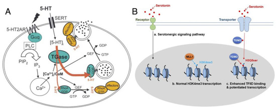 Examples of protein serotonylation: (A) Serotonylation of small GTPases. Upon stimulation of platelets by 5-HT, the phosphatidyl inositol pathway is activated, resulting in a rise of cytoplasmic Ca2+. 5-HT signaling is mediated by the G-protein-coupled 5-HT2AR and by transport into the cytoplasm by SERT. The contents of α-granules are released into circulation (for example, vWf, black circles) or exposed at the plasma membrane; figure reproduced from [15] (© 2003 Cell Press). (B) Regulation model of 5-HT and effect of histone H3 serotonylation, reproduced from Fu et al. [44] (distributed under the terms of the Creative Commons Attribution 4.0 International License, available creativecommons.org/license/by/4.0). The H3K4me3Q5ser double modification enhances the interaction of histone with certain H3K4me3 “reader” proteins, such as TFIID, and then reinforces permissive patterns of gene expression.