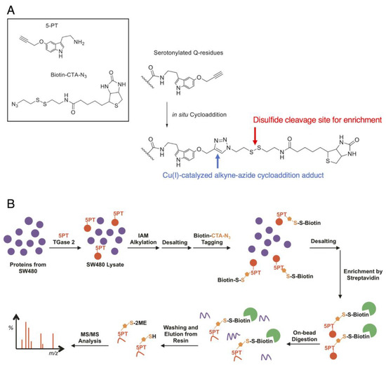 Protein serotonylation by 5-propargylserotonin: (A) The approach utilizes the click reaction between 5-propargylserotonin (5-PT) and biotinylazido-cystamine (biotin-CTA-N3, both as shown in the box in the upper left) as a TGM2 surrogate for 5-HT. The conjugation occurs in situ to produce a triazole adduct (right, blue arrow) that is stable under mass spectrometry. When a cleavable moiety is integrated into the linker, e.g., a disulfide structure (right, red arrow), the biotin moiety can be cleaved for elution. (B) A proteomic workflow to enrich serotonylated proteins.