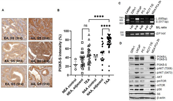 PI3Kδ-S splice isoform is overexpressed in AA PCa with highly activated AKT/mTOR signaling. (A) IHC staining of representative AA and EA PCa tissue samples with different Gleason Scores (GS). (B) Quantification of PI3Kδ-S intensities, based on IHC staining signals, of normal EA (NEA), normal adjacent and tumor samples from EA PCa (NEA, adjacent and TEA), normal AAs (NAA), normal adjacent and tumor samples from AA PCa (NAA, adjacent and TAA). **** p-value < 0.0001, based on one-way ANOVA with Tukey’s post hoc test. ns: not significant. (C) RT-PCR analysis of PIK3CD-L and PIK3CD-S expression levels in a panel of cell lines derived from EA PCa (22Rv1, LNCaP, and PC-3) and AA PCa (RC77 T/E and MDA PCa 2b). EIF1AX was used as an endogenous control. (D) Western blot analysis of PI3Kδ isoforms (L and S), pAKT, AKT, pmTOR, mTOR, pS6, S6, and β-actin in EA PCa (22Rv1, LNCaP, and PC-3) and AA PCa (RC77 T/E and MDA PCa 2b) cells.