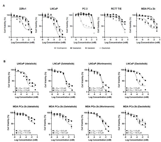 Cell viability curves of the PCa cells treated with PI3Kδ-specific, pan-PI3K, and PI3K/mTOR inhibitors by MTT assays. (A) Cell viability curves from EA PCa cell lines (22Rv1, LNCaP, and PC-3) and AA PCa cell lines (RC77 T/E and MDA PCa 2b) in presence of Idelalisib, Seletalisib, Wortmannin, and Dactolisib at concentrations from 0 to100 µM. (B) Cell viability curves from PIK3CD-L- and PIK3CD-S-expressing LNCaP and MDA PCa 2b cells in the presence of four drugs at concentrations from 0 to100 µM. All the MTT assay results (in A and B) were calculated based on six experimental repeats for each drug dose, and the data values represent mean ± SD. The IC50 values were determined from the viability curves by using GraphPad Prism 9 program.