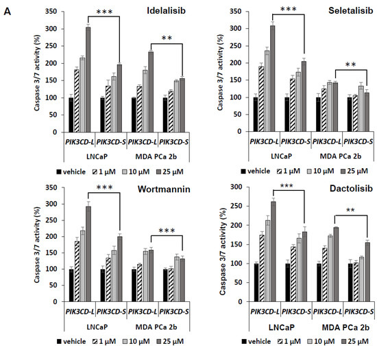 Next, we tested whether these four drugs induce differential cell apoptotic manners in the PIK3CD-L- vs. PIK3CD-S-expressing PCa cells. As shown in Figure 3A, the PIK3CD-L-expressing LNCaP and MDA PCa 2b cells have exhibited an overall significantly higher cell apoptosis activity in response to the inhibitors, when compared to the PIK3CD-S-expressing LNCaP (p-value < 0.001) and MDA PCa 2b cells (p-value < 0.01 or <0.001) (Figure 3A). Moreover, PIK3CD-L-expressing LNCaP and MDA PCa 2b exhibited high sensitivities to the inhibitors in a dose-dependent manner. Specifically, 2.5- to 3-fold higher cell apoptotic activities were observed in PIK3CD-L-expressing LNCaP treated with 25 µM drug vs. vehicle. There were 1.4- to 2-fold increased apoptotic activities detected in PIK3CD-L-expressing MDA PCa 2b under drugs at 25 µM vs. vehicle, whereas ≤2-fold and ≤1.5-fold increases in cell apoptosis were detected in PIK3CD-S-expressing LNCaP and MDA PCa 2b treated with 25 µM drug vs. vehicle, respectively (Figure 3A). These results suggest that PIK3CD-S-expressing PCa is more antiapoptotic, compared to PIK3CD-L-expressing PCa, in response to the drugs.