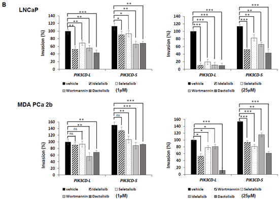 Next, we performed cell invasion assays to assess how PI3KCD-L and PI3KCD-S affect the cell invasiveness in PCa. First, the PIK3CD-L- and PIK3CD-S-expressing LNCaP and MDA PCa 2b were treated with the same four drugs, followed by matrigel invasion assays. As anticipated, the four drugs exerted intermediate (35–55%) and potent (>80%) inhibitory effects on the PIK3CD-L-expressing LNCaP cells at 1 µM and 25 µM, respectively. In contrast, the four drugs exerted slight/intermediate (10–35%) and intermediate (20–45%) inhibitory effects on the PIK3CD-S-expressing LNCaP cells at 1 µM and 25 µM, respectively (Figure 3B, top panels). On the other hand, the PIK3CD-L-expressing MDA PCa 2b cells did not respond to Idelelisib nor Seletalisib at 1 µM and the invasive capacities were moderately inhibited (35–45%) by Wortmannin and Dactolisib at 1 µM (Figure 3B, top left panel). However, the cell invasion capacities of the PIK3CD-L-expressing MDA PCa 2b cells were moderately to significantly inhibited (20–90%) by all the drugs at 25 µM (Figure 3B, bottom right panel). Notably, the four drugs have demonstrated slight/intermediate (10–35%) and intermediate (25–55%) inhibitory effects on the cell invasion in the PIK3CD-S-expressing MDA PCa 2b cells at 1 µM and 25 µM, respectively (Figure 3B, bottom panel). In summary, we observed: (1) the PIK3CD-S-expressing cells have 15–20% higher invasive capacities than the PIK3CD-L-expressing cells in both the LNCaP and MDA PCa 2b backgrounds; (2) the MDA PCa 2b cells (endogenously expressing a higher PIK3CD-S level) have shown a generally higher resistance to the drug-mediated invasiveness inhibition, compared to the LNCaP cells (by comparing Figure 3B, bottom vs. top panels); and (3) the PIK3CD-S-expressing cells exhibit a higher resistance to the drug-mediated invasiveness inhibition, when compared to the PIK3CD-L-expressing cells (in both the LNCaP and MDA PCa 2b backgrounds). Taken all together, the cell apoptosis and invasion assay results have strongly suggested that the overexpression of the PIK3CD-S splice variant results in more oncogenic activities with enhanced antiapoptotic and invasive capacities.