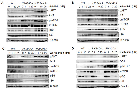 Inhibitory effects on PI3K/AKT/mTOR signaling in PCa cells overexpressing PIK3CD-L and PIK3CD-S variants in response to pan-PI3K, PI3Kδ, and PI3K/mTOR dual inhibitors. Western blot analysis of pAKT, AKT, pmTOR, mTOR, pS6, and S6 in MDA PCa 2b cells stably expressing PIK3CD-L and PIK3CD-S in presence of (A) Idelalisib, (B) Seletalisib, (C) Wortmannin, and (D) Dactolisib at concentrations of 0, 1, 10, and 25 μM. β-actin was served as an endogenous protein control.