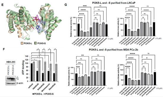 Molecular modeling of interactions between small-molecule inhibitors and PI3Kδ-L or PI3Kδ-S splice isoform. Molecular docking modeling using AutoDock Vina demonstrates the predicted physical interactions between PI3Kδ-L and PI3Kδ-S with (A) Idelalisib, (B) Seletalisib, (C) Wortmannin, and (D) Dactolisib. (E) Molecular modeling for ATP (ball-and-stick chemical) binding with PI3Kδ-L (brown) and PI3Kδ-S (green). (F) ATP-binding assays with PI3Kδ-L and PI3Kδ-S in competition with the four PI3K inhibitors (right panel). Western blot analysis (left panel) confirmed the comparable amounts of PI3Kδ-L and PI3Kδ-S were purified from PIK3CD-L- and PIK3CD-S-expressing HEK-293 cells, for the ATP-competitive assays. Data values were represented as mean ± SD from 3–4 independent experiments. *, ** p-values (<0.05 and <0.01) were determined based on one-way ANOVA with Tukey’s post hoc test. (G) Cell-free PI3 kinase assays of purified PI3Kδ-L and PI3Kδ-S complexes incubated with four small-molecule inhibitors at 1 and 10 µM. The purified PI3Kδ-L and PI3Kδ-S complexes were from LNCaP and MDA PCa 2b cells transfected with pcDNA3.1-PIK3CD-L-V5-His and pcDNA3.1-PIK3CD-S-V5-His plasmids. **, ***, **** p-values (<0.01, <0.001, and <0.0001) were determined based on one-way ANOVA with Tukey’s post hoc test. ns: not significant. Data values represent mean ± SEM from 3–4 independent experiments with duplicated repeats.