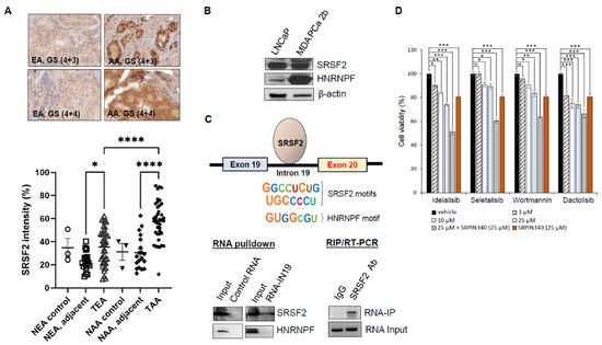 SRSF2 mediates skipping of exon 20 in PIK3CD pre-mRNA, and inhibition of SRPK1/2 sensitizes PIK3CD-S-expressing PCa to Idelalisib, Seletalisib, Wortmannin, and Dactolisib. (A) IHC staining of SRSF2 on a TMA containing 40–50 EA and AA PCa specimens. Representative IHC images of SRSF2 staining in EA and AA PCa with GS (4 + 3) and GS (4 + 4) are presented (top panel). Quantification of SRSF2 intensities in samples derived from NEA, NEA adjacent, TAA, NAA, NAA, NAA adjacent, and TAA. p-values (* <0.05, **** <0.0001) were determined based on one-way ANOVA with Tukey’s post hoc test. (B) Western blot analysis revealed that SRSF2 and HNRNPF were upregulated in MDA PCa 2b (AA PCa) vs. LNCaP (EA PCa) cells. (C) RNA pulldown and RIP/RT-PCR assays revealed that SRSF2 is the critical RNA-binding protein at the flanking intron adjacent to exon 20 of PIK3CD pre-mRNA. Two major SRSF2 and one HNRNPF putative binding motifs located in intron 19 were highlighted (top panel). Representative Western blot and gel images from RNA pulldown and RIP/RT-PCR assays were presented to confirm the SRSF2 binding at RNA fragment of flanking intron (RNA-IN19) covering the 2 SRSF2 and 1 HNRNPF motifs. (D) MTT assays for PIK3CD-S-expressing MDA PCa 2b in the presence of vehicle, small-molecule inhibitors (at 1, 10, and 25 µM), SRPIN340 (25 µM), and combination therapy (25 µM small-molecule inhibitor and 25 µM SRPIN340). p-values (* <0.05, ** <0.01, *** <0.001) were determined based on one-way ANOVA with Tukey’s post hoc test. ns: not significant. Data values represent mean ± SD from 4–5 independent experiments.