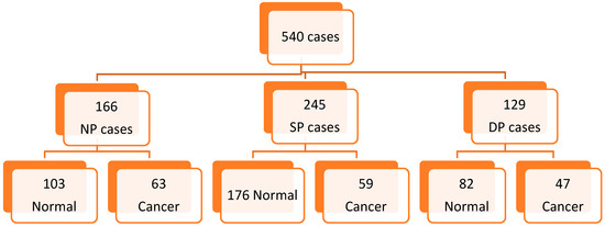 The recall rates were higher in the NP (0.444) and DP (0.461) cases than in the SP cases (0.353). True positive rates in NP and DP cases were 12.8% and 10.3% higher than SP cases (0.803 and 0.785 vs. 0.712). In contrast, true negative rates in NP and DP cases were 4.8% and 2.0% lower than SP cases (0.749 and 0.771 vs. 0.787). The AUC values for NP and DP cases were significantly higher than that for SP cases (0.814 and 0.820 vs. 0.782; p < 0.0001). Higher AUC values for NP and DP cases compared with SP cases were also found in both low breast density cases (0.819 vs. 0.800; <0.05) and high breast density cases (0.810 and 0.818 vs. 0.759; p < 0.0001) (Table 3).