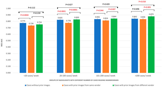 ROC AUC performances of radiologists with different experience in number of cases read per week.
