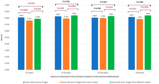 ROC AUC performances of radiologists with different experience in number of years reading mammograms.