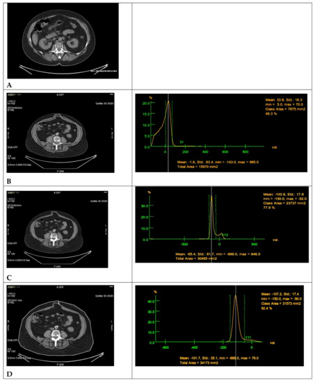 The VATA (visceral adipose tissue area, cm2) was measured by drawing a freehand ROI including the abdominal region, excluding the abdominal muscle region and SAT (subcutaneous adipose tissue), and selecting, within the aforementioned ROI, only tissues with adipose density (−150 to −50 HU approximately) (Figure 1C).
