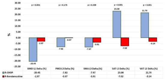 Furthermore, the difference in mean values pre–post-therapy of BMD, SMD, and SMA in the R-CHOP patient group is lower than in the R-B group (Δ(%) = BMD/R-CHOP = −20.45%, Δ(%) = BMD/R-B = −2.97%, p < 0. 001; Δ(%) = SMD/R-CHOP = −7.82, Δ(%) = SMD/R-B = −0.07%, p = 0.176; Δ(%) = SMA/R-CHOP = −7.97%, Δ(%) = SMA/R-B = −3.91%, p = 0.339). In addition, there is an increase in SAT and VAT values in the R-CHOP group; for VAT: Δ(%) = VAT/R-CHOP: 21.70%, Δ(%) = VAT/R-B: −3.14%, p < 0.001; for SAT: Δ(%) = SAT/R-CHOP: 23.08%, Δ(%) = VAT/R-B: −7.02%, p < 0.001; see Table 3 and Figure 3.