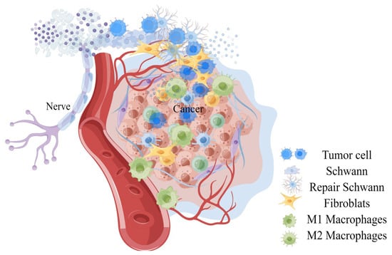 Infiltrating cells constituting the tumor matrix include fibroblasts, bone marrow-derived cells (BMDCs), tumor-associated monocytes and macrophages, endothelial cells, endothelial progenitor cells (EPC), myeloid-derived suppressor cells (MDSCs), neurons, T regulatory cells (Treg), and pericytes, and different components in neuroimmune axis and many other unrelated pedigrees, and extra-cellular components (cytokines, growth factors, hormones, extracellular matrix, etc. (see Figure 1 and Table 1) [41,42]. Several populations of BMDCs are recruited into TME and niche, where they can differentiate into tumor-promoting populations, such as EPC, MDSCs, and macrophage-like cells [3]. Factors derived by cells in this microenvironment promote the migration and proliferation of adjacent vascular cells, tumor cells, and neurons, and grow together with tumors [43,44].