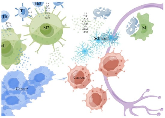 TAMs are generally considered to be M2 macrophages in the TME which, when exposed to hypoxia or lactate, secretes a variety of cytokines with metabolic functions, including IL6, TNF, CCL5, and CCL18 to enhance PNI [47]. TAMs express PD-L1 and can directly reduce the activation of T cells, then suppress the anticancer immune responses [42]. In addition, TAMs can promote tumor progression and invasion by up-regulating matrix metalloproteinases (MMPs) [54,55]. Carcinoma-produced MMP1 activates neuronal protease-activated receptor 1 (PAR1) and induces substance P (SP) release, activating carcinoma neurokinin 1 receptor (NK1R), which plays a pivotal role in tumor progression and PNI [42,56]. Macrophage-derived IL-1β induces non-neuronal cells to synthesize nerve growth factor (NGF), and activated macrophages can also release glial cell-derived neurotrophic factor (GDNF)-activated RET receptors to trigger tumor cell migration.
