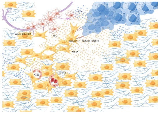 They are responsible for the synthesis, deposition, and remodeling of most of the ECM in the tumor matrix and are thought to be sources of growth factors that affect paracrine, which affect the growth of cancer cells and have been shown to provide key signals supporting tumor progression and allow a small population of cancer cells to escape treatment [65,66,67,68]. Such as transforming growth factor β (TGF-β) secreted by CAFs induced a fibroblastic response in the surrounding environment to synthesize collagen, stiffen the tissue, and destroy microvascular structure by extensive collagen cross-linking, then the mechanical stress of the connective tissue collapses the nearby blood vessels to promote hypoxia [69]. Under hypoxic conditions, interleukin-6(IL-6) produced by cancer cells induces the activation of Schwann cells and triggers the development of PNI [70], which is also accompanied by the activation of a series of hypoxia-associated signaling pathways. In addition, a dense structure formed by fibrosis around a cluster of cancer cells in an adenocarcinoma caused internal high and lead to the rupture of glandular structure, simultaneously, the high-density fibers formed a track that contributed to the movement of the cancer cells to overflow and diffuse quickly [64]. By the anisotropic E-cadherin/N-cadher in junction, the frontier CAFs exert the physical force to enable the synergistic invasion of CAFs and cancer cells through a dual mechanism: CAFs pull cancer cells away from the tumor facilitating the invasion of cancer cells, while cancer cells polarize its migration away from the tumor to enhance the diffusion of CAFs [71,72]. In addition, fibroblasts contribute to Schwann-cell-induced axonal growth and, after nerve injury, ephrin-B on fibroblasts activates EphB2 receptors on Schwann cells, and fibroblasts through the ephrin-B/EphB2 signaling pathway induce Schwann cells to migrate through bridges as dense groups or cords to guide axons through injury site [73]. At the same time, CAFs can regulate the N-cadherin/β-catenin pathway through the production/secretion of the axonal guidance molecule Slit2, affecting the neural remodeling related to glandular catheter adenocarcinoma [74]. On the other hand, CAFs promote cancer invasion by secreting factors that cause cancer cell activation and matrix remodeling. Studies have shown that CAFs exist at the PNI site and the produced inactive matrix metalloproteinase-2(MMP-2) is activated by membrane-type 1 matrix metalloproteinase (MT1-MMP) produced by tumor cells, which degrades extracellular collagen in the perineural niche and promotes the spread of cancer cells in the perineural space [68,75].