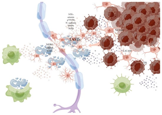 The interaction between nerve and cancer cells leads to the relationship of mutual growth promotion via the action of neurotrophic factors (NTFs) from nerve and cancer cells, and the pro-invasive and proliferative characteristics of autonomic neurotransmitters from nerve fibers [86,88].