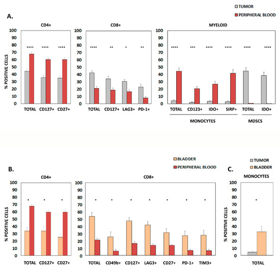 Comparative analysis of samples from peripheral blood and healthy bladder tissue (Figure 1B) showed higher amounts of total CD4+ lymphocytes, CD4+ CD127+ lymphocytes and CD4+ CD27+ lymphocytes in the blood, while increased percentages of total CD8+, CD8+ CD49b+, CD8+ CD127+, CD8+ LAG3+, CD8+ CD27+, CD8+ PD-1+ and CD8+ TIM3+ lymphocytes were detected in the bladder. Finally, only a significant increase in bladder total monocytes was found when comparing bladder and tumor samples (Figure 1C).