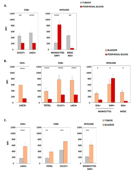 Markers with differential levels of expression in samples from patients with urothelial bladder carcinoma. (A) Graphics show the mean fluorescence intensity (MFI) of surface molecules expressed in CD8+ lymphocytes and myeloid cells from patient tumor samples and peripheral blood. (B) Graphics show the MFI of surface molecules expressed in CD4+ lymphocytes, CD8+ lymphocytes and myeloid cells from patient bladder tissue and peripheral blood. (C) Graphics show the MFI of surface molecules expressed in CD4+ lymphocytes, CD8+ lymphocytes and myeloid cells from patient bladder tissue and tumor samples. In all cases, only statistically significant results (Mean + SD of MFI) are shown; * p < 0.05; ** p < 0.01; *** p < 0.001; **** p < 0.0001. MDSC, myeloid-derived suppressor cells.