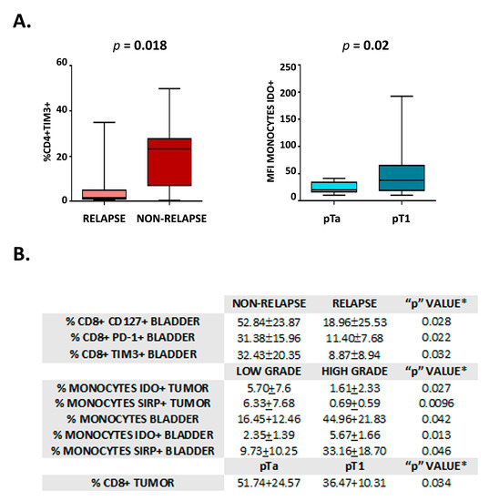Analysis of immune markers for tumor evolution and patient outcome. (A) Graphics show the percentage of CD4+ TIM3+ lymphocytes in the peripheral blood of individuals with Non-relapse vs. Relapse (left) and the percentage of monocytes IDO+ in the peripheral blood of individuals with pTa vs. pT1 (right). Statistical significance is shown (p). (B) Table showing the statistically significant results of the univariable analysis to compare individuals with either Non-relapse/Relapse, Low grade/High-grade tumors, and pTa/pT1 tumors. Values correspond to mean ± SD, * student t-test.