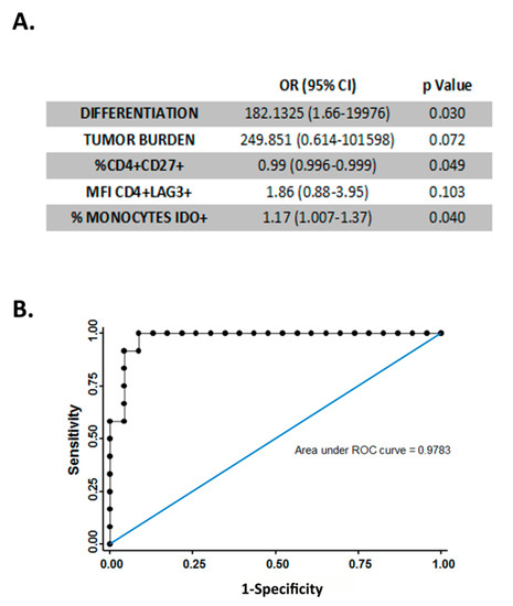 In order to determine whether previously analyzed immune markers could be used as independent markers for tumor progression or patient outcome, a multivariable logistic regression analysis was performed considering relevant variables such as histological grade and tumor size. This analysis showed that the percentage of CD4+ CD27+ cells and IDO+ monocytes remained independent predictors of tumor progression (Figure 4A). This model, which combines immune parameters of patient peripheral blood with histological grade and tumor size, discriminates pTa and pT1 tumors with a sensitivity of 75%, a specificity of 96.65%, a positive predictive value of 90%, and a negative predictive value of 88% (area under ROC curve is 0.9783) (Figure 4B).