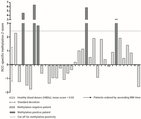 RCC-specific methylation score for healthy blood donors (HBDs) and patients. For HBDs, the mean and standard deviation is indicated. The cut-off for methylation positivity, represented by the upper limit of the 95% confidence interval of the methylation score in HBDs, is indicated by a dotted line. The patients are ordered by WW time.