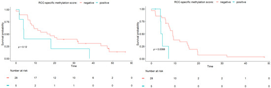 The aim of this study was to investigate whether cfDNA could be used as noninvasive biomarker to identify patients with mccRCC with a high risk of early disease progression during a WW period. Therefore, we first established an RCC-specific panel consisting of 22 methylation markers and subsequently evaluated the methylation score for this panel in 33 mRCC patients eligible for WW, based on a low or intermediate prognosis according to the IMDC score. We used a technique that applies a restriction enzyme to generate ≥32 bp methylated fragments for sequencing (MeD-seq). This method was previously shown to enable cfDNA methylation profiling with small amounts of fragmented cfDNA at relatively low costs [19,20].