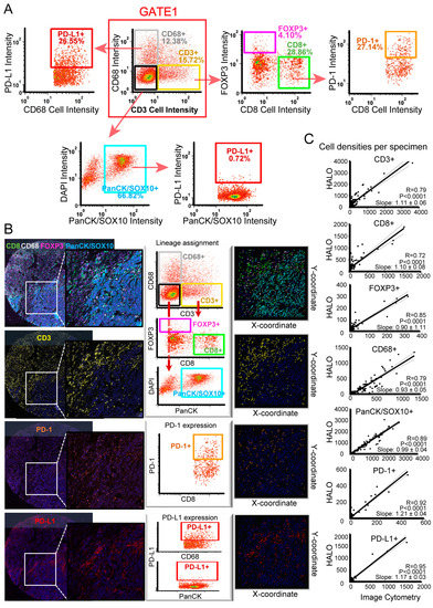 3.3. Multiplexed IHC Images Established Quantitative Assessment by Image Cytometry Analysis with Preserved TME Context Information