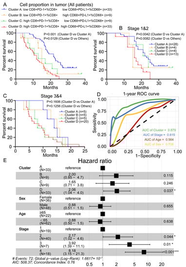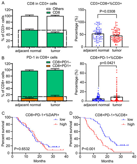 3.4. In Situ Leukocyte Analysis Identified the Proportion of PD-1 Expression in CD8+ TILs as a Risk Factor in PDAC