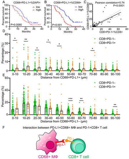 3.5. Spatial Analysis Revealed That PD-1+CD8+ T Cells Proximal to PD-L1+CD68+ Macrophages Are Associated with Poor Prognosis