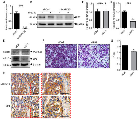 It has been reported that the expression of MMP2 was depressed in EP3 knock-out mice under hypoxic stress [21], which indicates a correlation between the expression of MMP2 and EP3. Our results showed that MMP2 was down-regulated in MAPK15 knockdown H1299 cells (Figure S1). To investigate whether EP3 is involved, we detect the expression of EP3 in H1299-shCtrl and H1299-shMAPK15 cells. We found that the mRNA and protein level of EP3 was significantly decreased in MAPK15-deficient cells (Figure 2A,B) and the protein level of EP3 was not affected by proteasome inhibitor MG132 (Figure 2B), suggesting that the decreased EP3 in H1299-shMAPK15 cells was transcriptionally regulated. Moreover, the migration of H1299 cells was inhibited (Figure 2F,G) after EP3 was knocked down (Figure 2C–E). The decreased EP3 in MAPK15 knockdown cells suggested that there might be a correlation between the expression patterns of these two molecules. Then, we detected the expression of EP3 in a serial section from the same tissue that we stained with MAPK15 antibody and found that the expression of EP3 is positively correlated with MAPK15 (r = 0.589, p < 0.001, Figure 2H and Table 2). Taken together, the above results show that MAPK15 affects cell migration through the regulation of EP3.