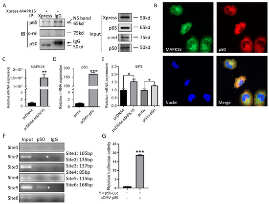 MAPK15 interacts with NF-κB p50 and p50 promotes EP3 expression by binding to EP3 promoter. (A) Immunoprecipitated proteins were resolved and the presence of MAPK15 and p50/c-rel/p65 were detected by anti-Xpress or anti-p50/c-rel/p65 antibodies. (B) The localization of MAPK15 and p50 in 4% paraformaldehyde-fixed H1299 cells were detected. (C–E) H1299 cells transfected with 2 μg pcDNA4, pcDNA4/Xpress-MAPK15, pCMV, and pCMV-p50 and the expression of MAPK15 (C)/p50 (D)/EP3 (E) was detected by real-time PCR. (F) Chromatin immunoprecipitation assay was used to detect the binding of p50 to EP3 promoter region; the asterisk indicates the immunoprecipitated EP3 promoter region. Original gels and gel quantification are shown in Figure S6. (G) In this study, 5 × p50-Luc plasmid was transfected with/without pCMV-p50 in H1299 cells and luciferase reporter assay was performed to detect the luciferase activity. * p < 0.05, ** p < 0.01, *** p < 0.001, Student’s t-test.