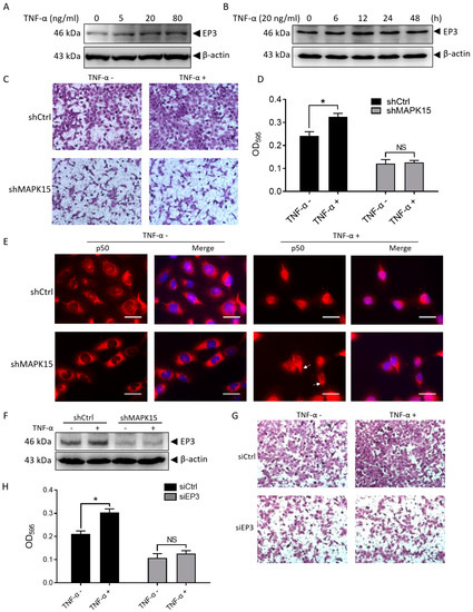 TNF-α promotes H1299 cell migration through induction of EP3 expression. (A) EP3 was detected in H1299 cells treated with different concentrations of TNF-α. (B) EP3 was detected in H1299 cells treated with 20 ng/mL TNF-α for different time points. (C,D) Transwell assay was used to detect migration effect of H1299-shCtrl and H1299-shMAPK15 cells with/without TNF-α treatment (20 ng/mL, 24 h), crystal violet in the migrated cells (C) was dissolved and absorbance was measured at OD595 (D). (E) H1299 cells cultured in serum-reduced medium (1% FBS) were stimulated with 20 ng/mL TNF-α for 1 h and p50 localization was detected in H1299 cells; scale bar represents 80 μm. (F) H1299-shCtrl and H1299-shMAPK15 cells cultured in serum-reduced medium (1% FBS) were treated with/without 20 ng/mL TNF-α for 12 h and the expression of EP3 was detected. (G,H) H1299 cells transfected with control siRNA or EP3 siRNA were resuspended in serum-reduced medium (1% FBS) and seeded to transwell chamber with/without 20 ng/mL TNF-α. Crystal violet in the migrated cells (G) was dissolved and absorbance was measured at OD595 (H). NS, non-significant; * p < 0.05, Student’s t-test.